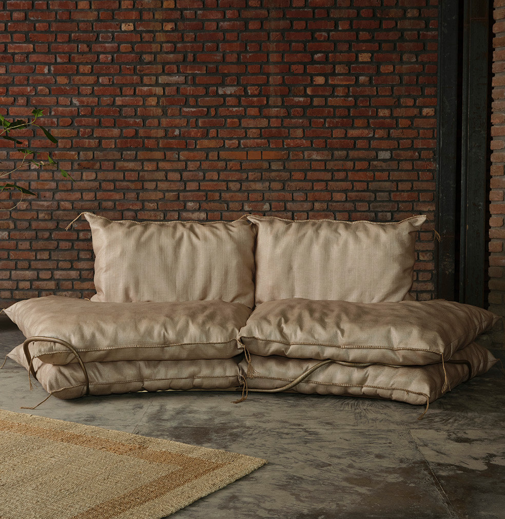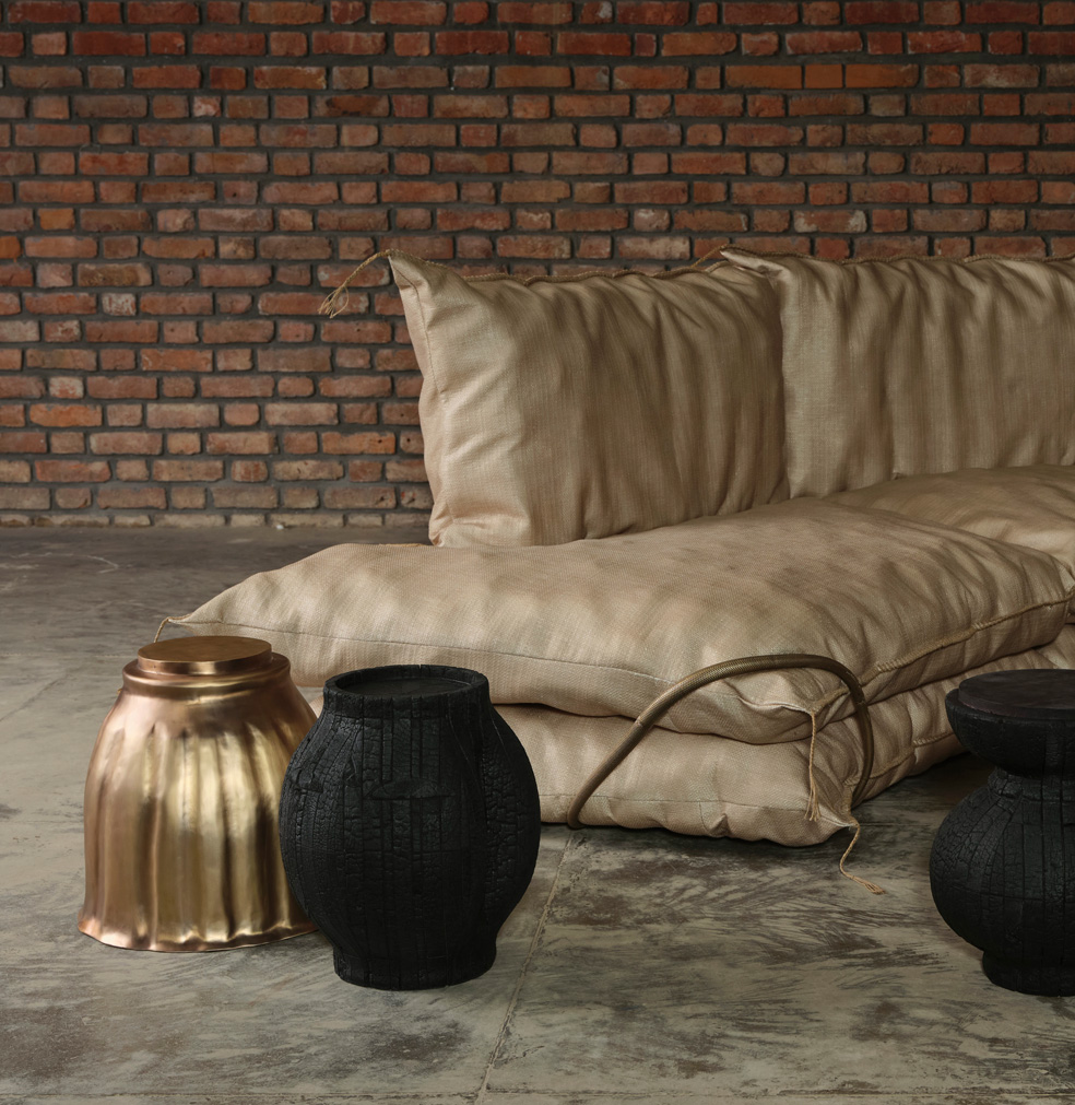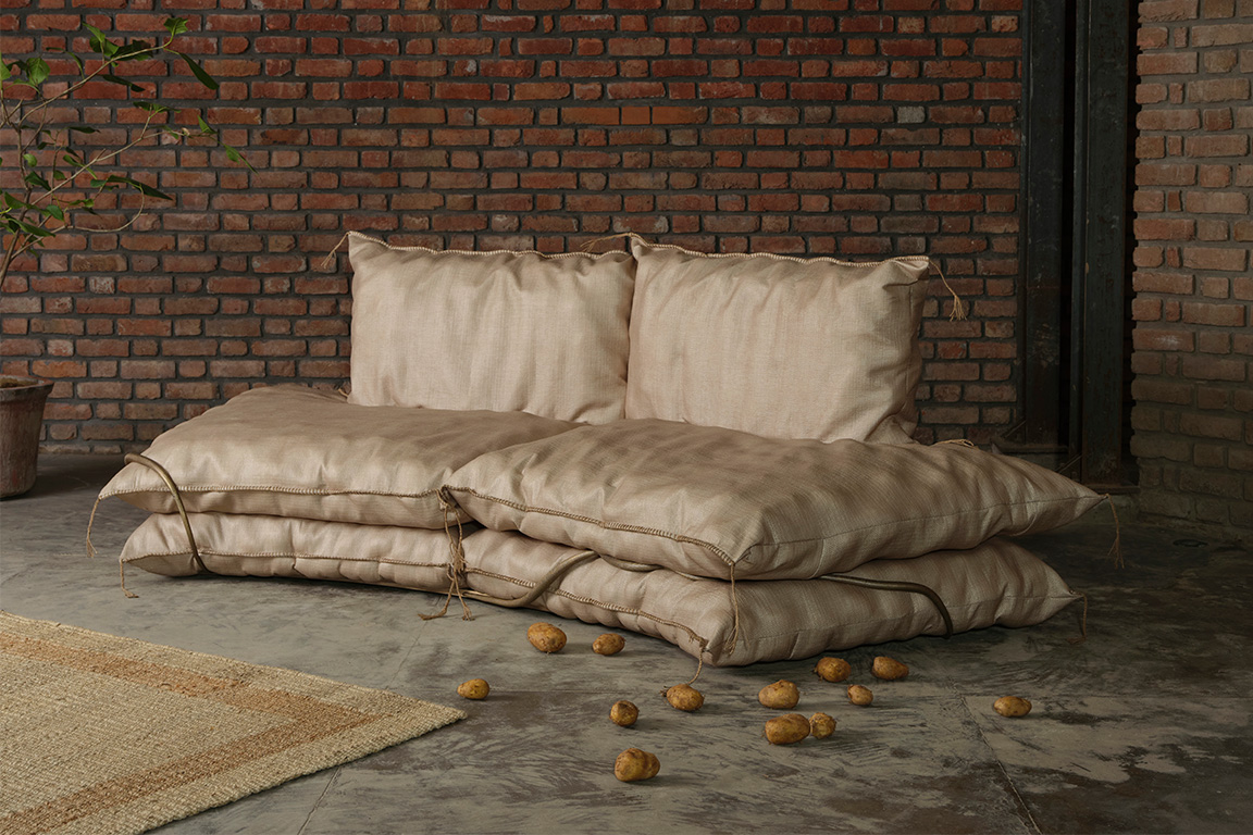 The Serpentine Aloo Bori Couch is a stack of jute sacks stuffed with foam potatoes commonly seen in Indian agriculture warehouses that is entwined with a luxurious serpent carved in brass. The sofa ideal for lounging is a pun on the common term ‘couch potato’.
