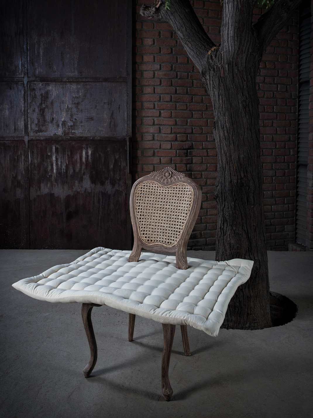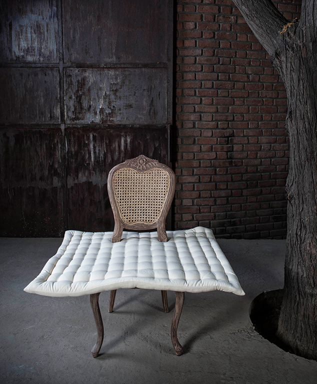 This chair questions the hierarchy of “high” and “low” design by juxtaposing elements from both genres in one eclectic piece of furniture. By making the gadda, a commonplace floor seating object, appear to float, the Gadda Floating Chair is a commentary on the history of seating in India, which was reserved for nobility.