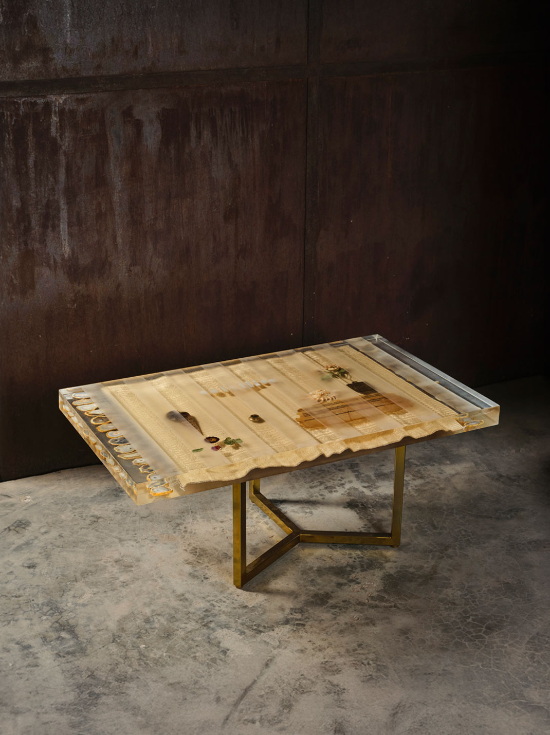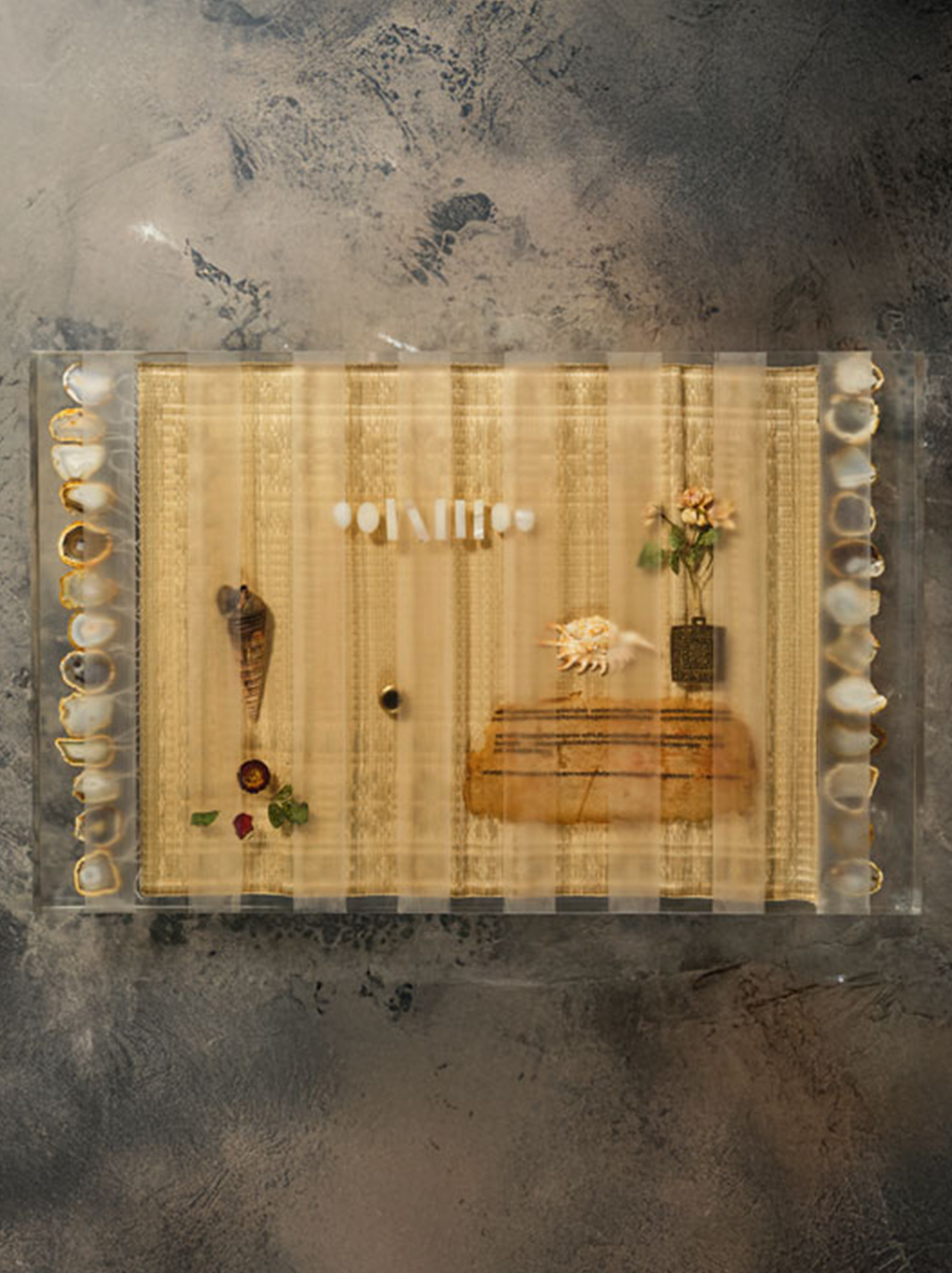 PCO or Preserving Craft Object is presented as a series of tableaux vivants (living pictures) where rarefied relics of Indian master craft with found objects are embedded into a block of resin, sometimes matched with other objects to tell a story. The tableaux are designed as table tops or wall art.