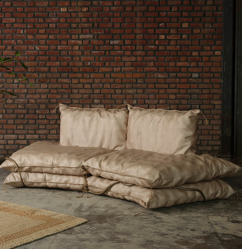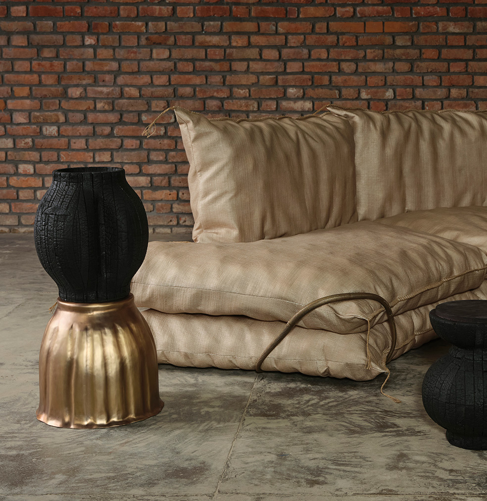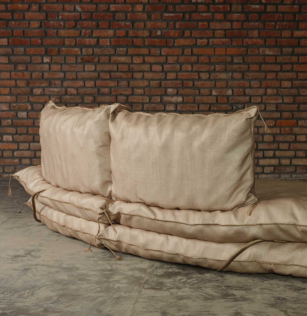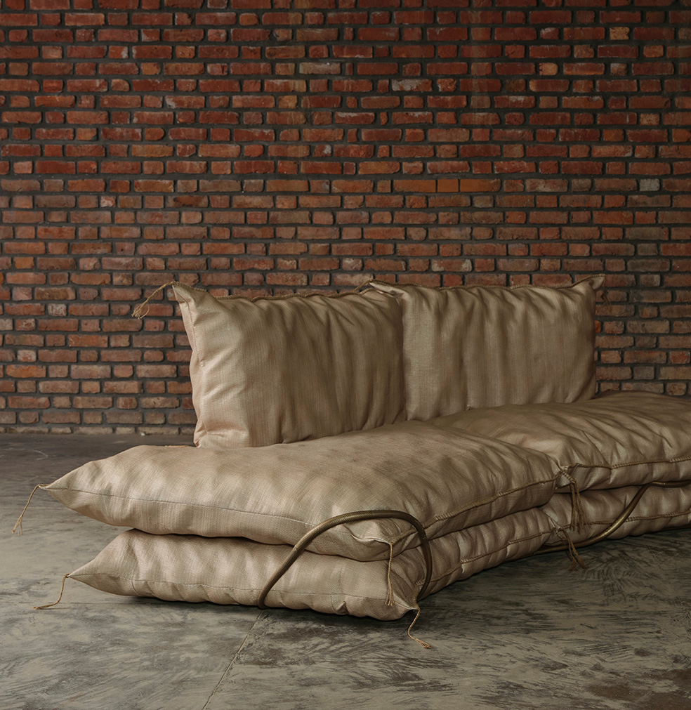 The Serpentine Aloo Bori Couch is a stack of jute sacks stuffed with foam potatoes commonly seen in Indian agriculture warehouses that is entwined with a luxurious serpent carved in brass. The sofa ideal for lounging is a pun on the common term ‘couch potato’.