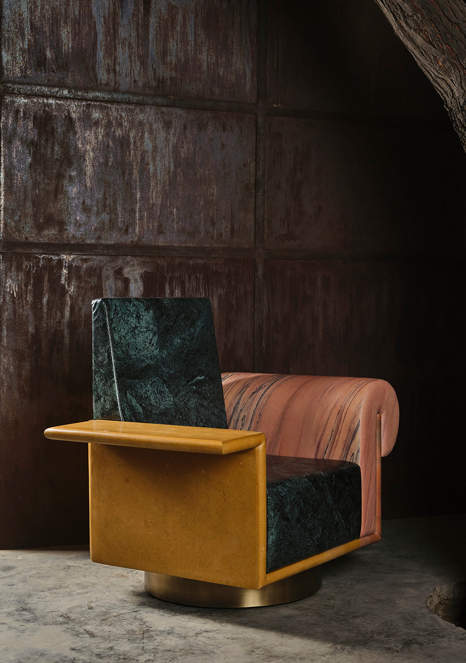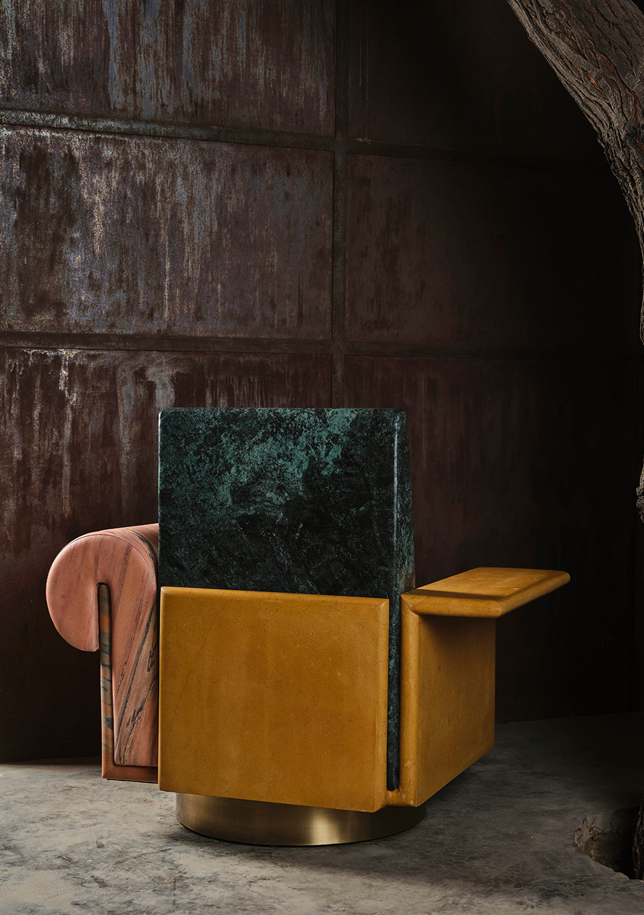 The Tutti Frutti Marble Kursi is a seat in a trio of Indian Marbles that plays with perception